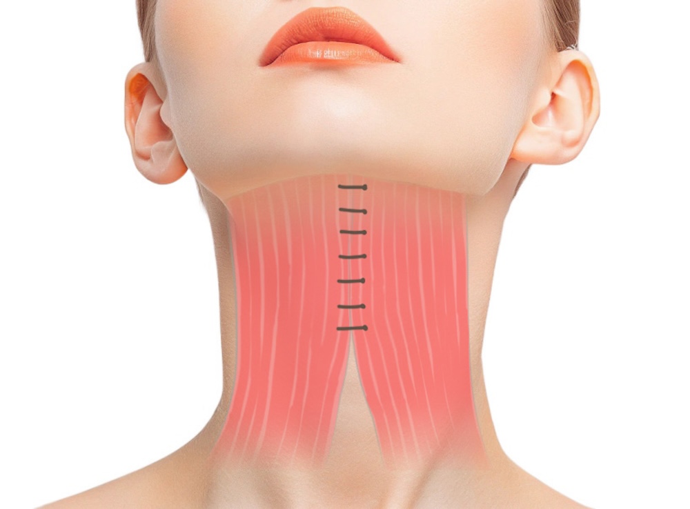 天鵝頸手術是從下顎下方一道3公分的切口進入,除了將淺層脂肪抽取減量、深層脂肪切除之外,最重要的步驟是把左右兩片擴頸肌對縫,讓頸部與下顎之間的空間收合上去。